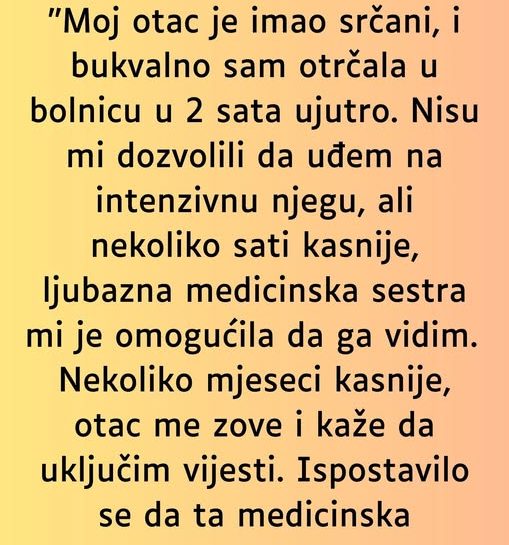 U 2 ujutro sam trcala u bolnicu nakon sto je moj otac dozivio srcani udari. Iako je ulazak u intezivnu jedicinu bio zabranjen to jeste odbijen nekoliko sati kasnije jedna jako dobra medicinska sestra mi je dala dopustenje da ga posjetim i udjem kod njega. Nekoliko mjeseci poslije otac me je kontaktirao i rekao da…