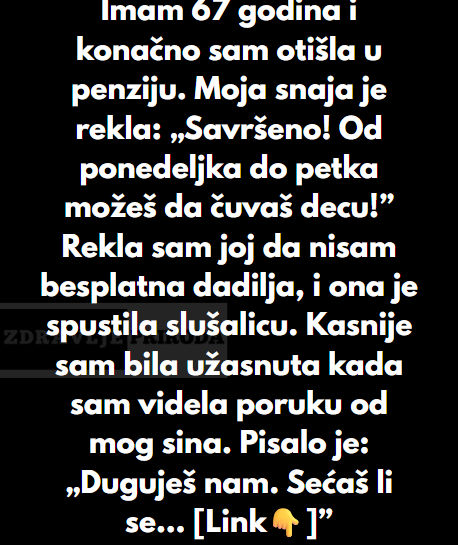 “Imam 67 godina i konacno sam i u penziji. A snajka je rekla: “SAVRSENO, mozes da cuvas unucice.”