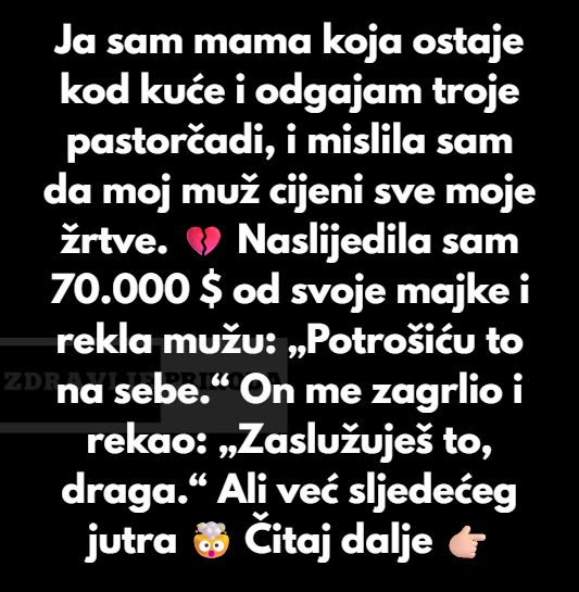 Ja sam ona majka koja je ostala kod kuce da bi cuvala troje djece od supruga i oduvijek sam mislila da moj suprug cijeni sve moje zrtve. Onda se desava da sam ja naslijedila od svoje majke 70.000 dolara i rekla sam suprugu: “Ovo trosim na sebe…” on me je zagrlio i rekao tada: “zasluzujes…