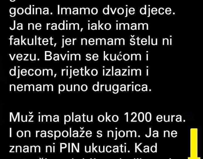 “Muz i ja zivimo skupa 14 godina a ja sam domacica jer nemam stele za posao-MUZ cuva svoju platu, ne znam ni PIN”