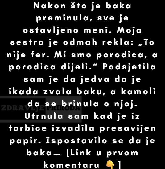 Baka mi je nedavno umrla a sve sto je zakonski imala je ostavljeno meni. ja sam bila ta koja je do zadnjeg trenutka njenog zivota bila sa njom, brinula se o njoj, vozila je na pregled i uvijek bila uz nju kada niko drugi to nije. Kada je moja sestra to saznala rekla mi je:…
