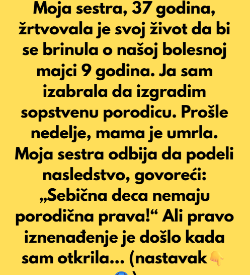 Sestra je zrtvovala 9 godina svog zivota da bi se brinula o bolesnoj majci a ja sada ne zelim se odreci nasljedstva jer nisam bila dobra kcerka!