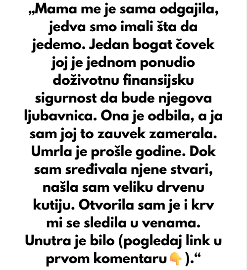 Moja majka me je sama odgajala a jedva smo imali sta da jedemo tada. Jedan bogati covjek nam je jednom ponudio dozivotnu sigurnsot da bi ja bila njegova ljubacnica. ona je odbila a ja sam joj zauvijek to sve zamjerila. Umrla je prosle godine a mi smo ljute bile jedna na drugu. Dok sam ja…
