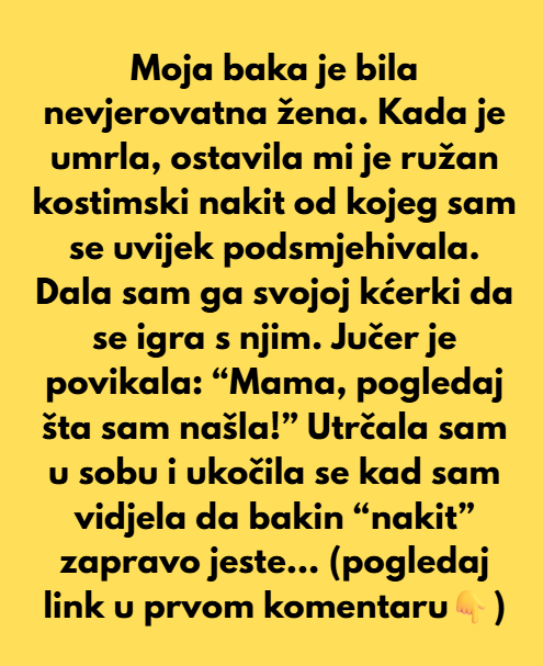 Jucer onako obican dan ona mi je povikala: Mama pogledaj sta sam ja pronasla” Utrcala sam u sobu i ukocila sam se kada sam vidjela da taj “bakin” nakit nije bio ono sto sam ja mislila. To je bila jeftina boja koja se malo orunila i otpao je kamencic i to je davalo izgled jako dragog kamena kao da je to pravo malo bogastvo.