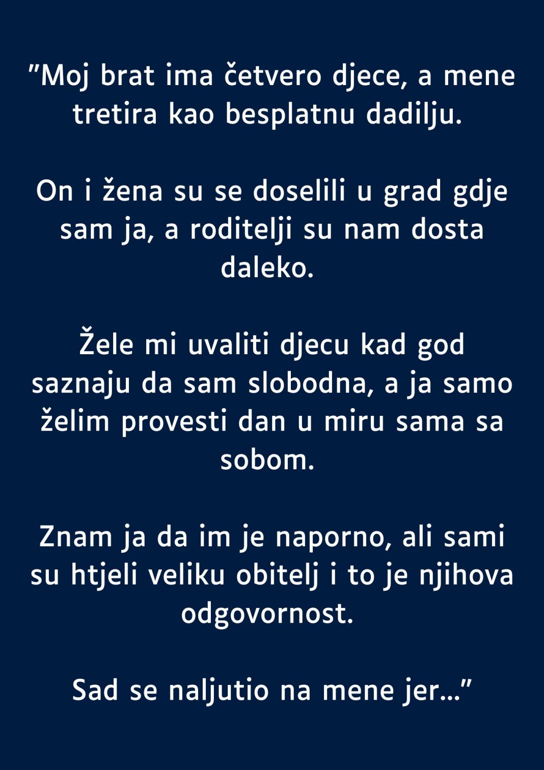 Oni jednostavno zele da mi uvale djecu kada god saznaju da sam ja slobodna a ja samo zelim da provedem dan u miru sa sobom. Znam da im je naporno sve ali sami su htjeli da imaju veliku porodicu da rode cetvero djece i ja sam stava da je to sada samo njihova odgovornost i nicija vise.
