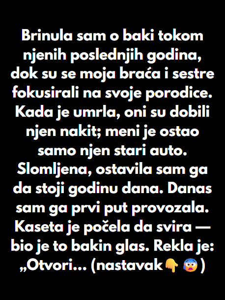 Ja sam se brinula o svojoj baki zadnjih godina njenog zivota dok su moja braca i sestre tada bili fokusirani na porodicu. Kada je umrla, oni su dobili njen nakit a meni je ostavila svoj stari auto. Slomljena sam bila, ostavila sam ga godinu dana da stoji jer sam bila tada jako ljuta.