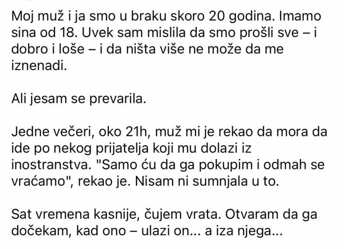 Suprug i ja smo u braku preko 20 godina. Imamo i velikog sina od 18 godina . Uvijek sam mislila da smo kroz nas zivot prosli sve i dobro i lose i da vise nista mene ne moze da iznenadi i da me dovede do nekog drugog stanja. Ali situacija je takva da sam se…