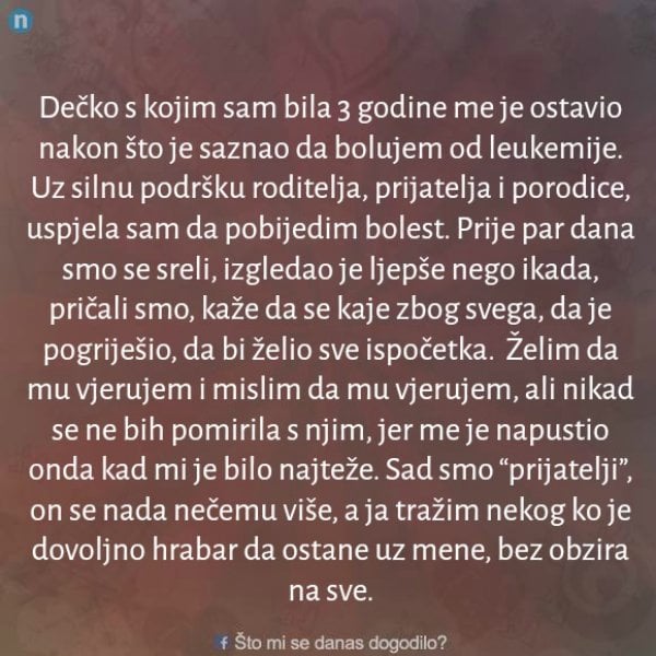 Decko sa kojim sam ja bila tri godine me je ostavio kada je saznao da bolujem od leukemije. Uz velike podrske porodice, prijatelja i svih uspjela sam da pobijedim bolesti i da se spasim i vratim. Prije par dana smo se sreli a on je tada izgledao ljepse nego ikada,pricali smo i kaze da se radi sveg toga kaje da je jako pogrijesio i da je odlucio i da bi zelio da sve pocnemo ispocetka. Zelim da mu vjerujem i zaista mislim da mu vjerujem ali nikada ne bi mogla da se pomirim sa njim i da jednostavnona sve to zaboravim jer on me je ostavio napustio kada je meni najteze bilo. Sada smo “prijatelji” on se jos uvijek nada necemo vise ali ja sam sada odlucila da trazim nekog drugog, hrabrog da ostane uz mene bez obzira na sve sto se desava kod mene.