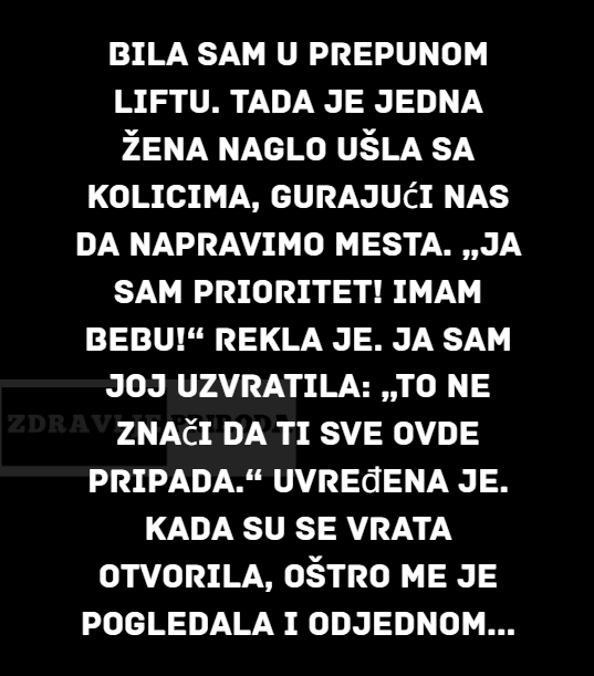 “Sacekajte sledeci bolje bi vam bilo..” Neko je vikao sa zadnje strane pokazujuci kako je lift vec pun i da nema mjesta za guranje. Ali toj zeni to nije bilo vazno. Bila je u zurbi pa se na sve nacine probijala unutra i govorila je: “Ja sam sada prioritet, ja imam bebu…”