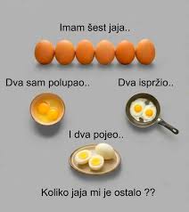 “Imam 6 jaja. Polomio sam 2, ispržio 2 i pojeo 2. Koliko jaja mi je ostalo?”