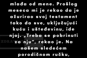 Nekoliko sati poslije otisao sam da provjerim svoju trudnu zenu koja se u tim trenutcima povukla u tisini da bi se odmorila ali tada sam se zaledio kada sam vidio da ona stoji nepomicna, sirom otvorenih ociju i jasno je strah iz njenih ociju se vidio.