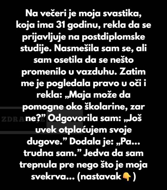 Prosli vikend dok smo bili na veceri kod moje taste i tasta ona je ustala i objavila da sada je prijavila postdiplomske studije psihologije. SVI SU tada aplaudirali i pomislila sam”Jako dobro za nju.” i to je sve-