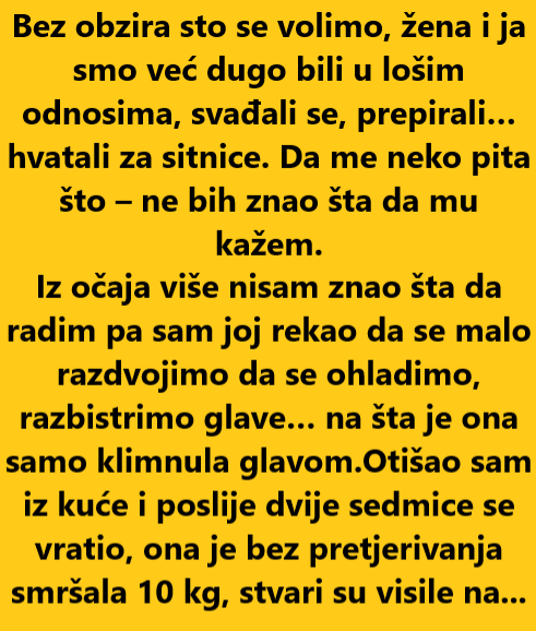 Koliko god se moja supruga i ja voljeli vec dugo vremena nas odnos je jako los, nije onakav kakav je bio prije. Svadje su bile nasa svakodnevnica prepirke su se vodile oko svega a svako od nas je pronalazio razlog da se uhvati za nesto glupo. Cesto sam se pitao zasto se to desava ali iskreno da me neko direktno pita radi cega smo se udaljili tako ja ne bi znao dati odgovor. Sve je izgledalo kao da se samo neki problemi gomilaju oko nas a da mi ne znamokako da nadjemo nacin da sve to rijesimo.