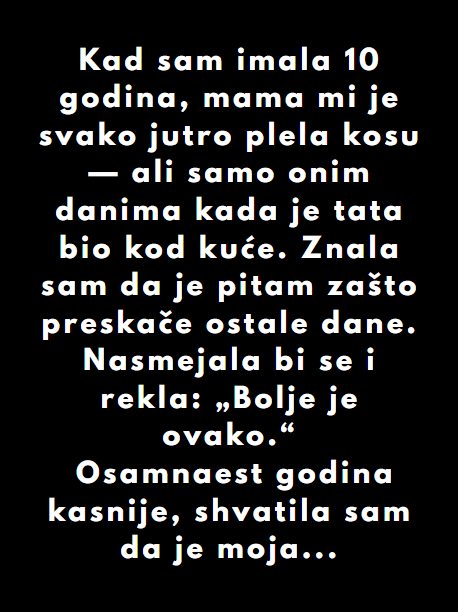 Sjecanje koje imam jeste da sam mala, da imam 10 godina i majka mi svako jutro plete kosu, ali samo onim danima kada je tata bio kod kuce je radila. Znala sam da je pitam zasto bi preskala ostale dane. Ona bi se cesto nasmijala i rekla mi: ” Bolje je ovako…”