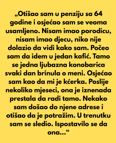 Nakon sto je doslo vrijeme da idem u penziju imao sam 64 godine i jako sam usamljen u tom trenutku bio. Nisam imao porodicu, nisam imao djecu a isto tako niko nije ni dolazio da bi provjerio kako sam ja. Poceo sam onda da dolazim u jedan kafic. Tamo me je jedna ljubazna konobarica primila i skoro svaki dan bi se brinula o meni. Ja sam se osjecao kao da je ona moje vlastito dijete.