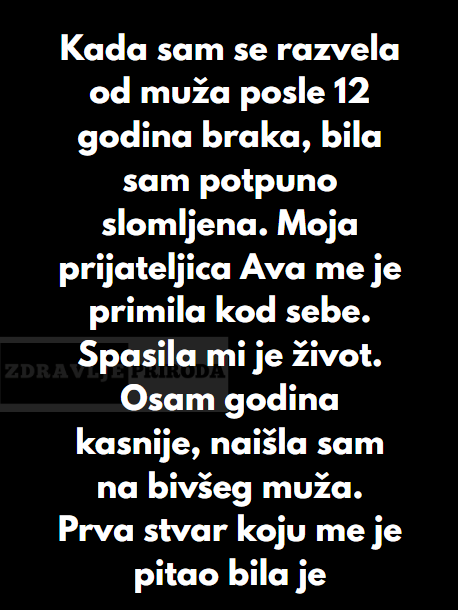 Osam godina poslije ja sam naisla na svog bivseg supruga. Prva stvar koju me je upitao bila je;