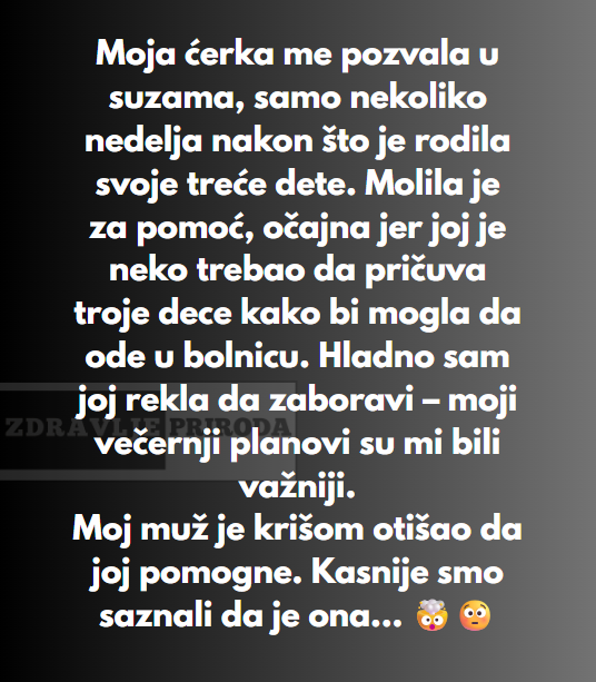 Moja kcerka me je pozvala u suzama i tada sam osjetila da joj glas drhti od bola i to se sve desavalo samo nekoliko nedelja nakon sto je rodila trece dijete. Molila je tada za pomoc i ocajna jer joj je neko trebao da bi pricuvao dijete jer ona mora da ode do bolnice. Hladno sam joj rekla da zaboravi na mene jer sam ja imala vecernje planove koji su bitniji mi bili i vazniji od njene hitne medicinske situacije. Umjesto toga predlozila sam da joj povedem babu i djecu u Hitnu pomoc i nisam slusala njene molbe. Moj suprug je bez mog znanja otisao da joj pomogne a kasnije smo shvatili da joj je pomoc zaista bila potrebna radi postporodjajnih komplikacija. Sada moja porodica je bijesna na mene i svi su sokirani da sam ja kcerku napustila u njenim trenutcima krize i tuge.