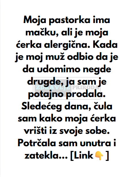Macka od moje pastroke joj je jedan period u zivotu bila utjeha kada je njena majka umrla. Ali sada moja je kcerka alergicna na macke. Kada je moj muz odbio striktno da udomimo macku negdje drugo ja sa odlucila da cu da je prodam.