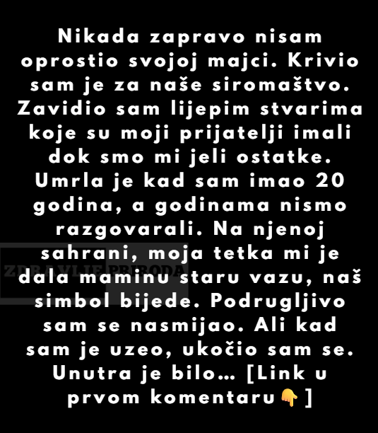 Ja nikada nisam oprostio svojoj majci, u srcu sam zelio ali je sve jace od mene bilo. Uvijek sam je krivio radi toga sto smo siromasni. Otac nikada nije ni bio u nasem zivotu pa je bila samo ona i cijeli zivot se borila da ja sastavim kraj sa krajem. U medjuveremu ja sam jako azvidio svim svojim prijateljima dok su oni jeli finu hranu i imali sve a ja jedva zivio.