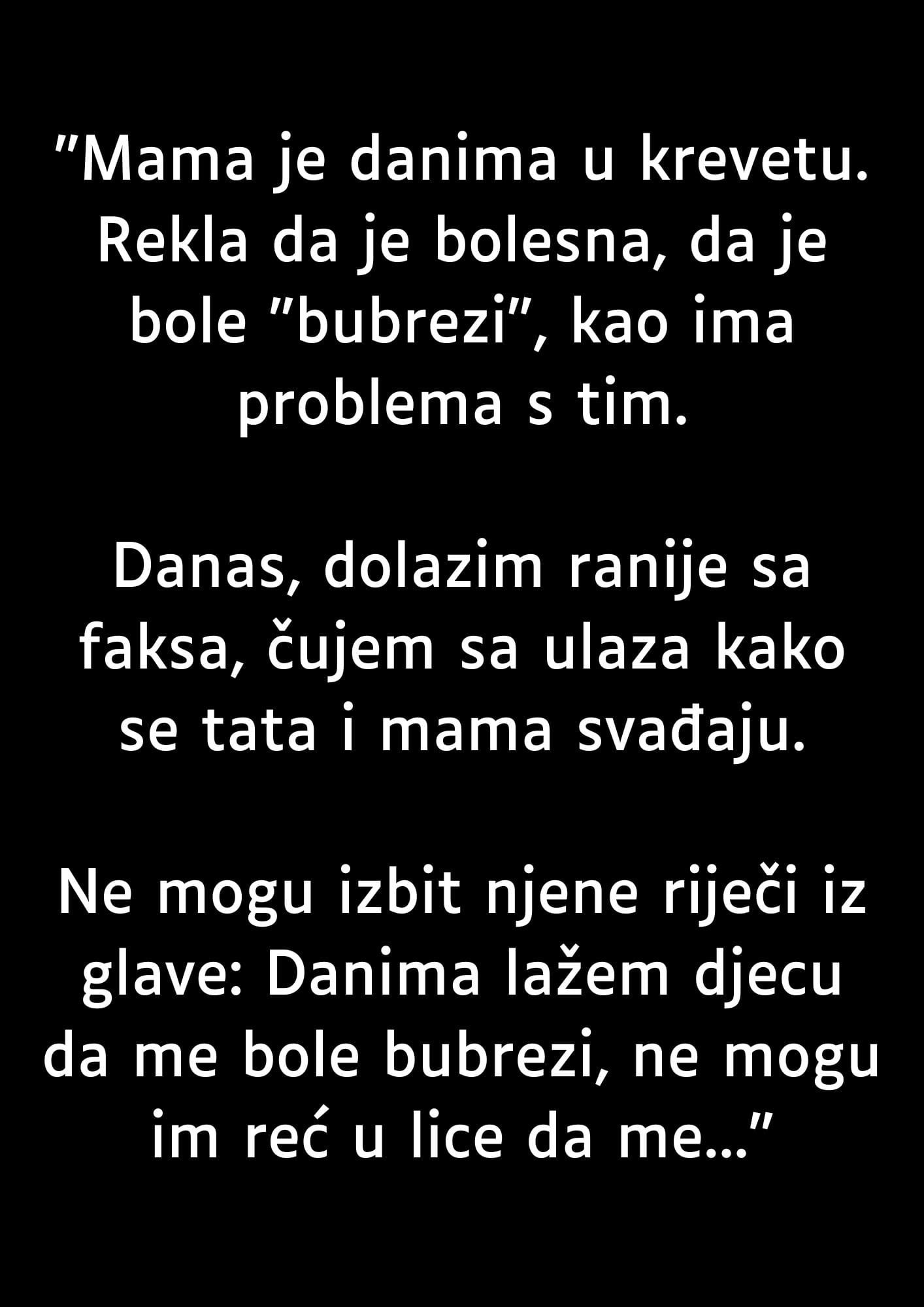 Moja majka zadnjih nekoliko dana je samo u krevetu prikovana i govorila je da nije dobro nikako i da se ne osjeca dobro. Kako je rekla bole je bubrezi i nelagodu ima oko toga. Gotovo da nema sumnje da imaju neki problemi a mene to toliko tisti da ne znam kako da joj u ovom trenutku pomognem. Kada sam se danas ranije vratio sa fakulteta mogao sam cuti kako su se moji roditelji jako puno svadjali a ja sam polako prilazio ulazu da bi cuo o cemu se radi jer su oni uvijek svoje privatne situacije cuvali za sebe.