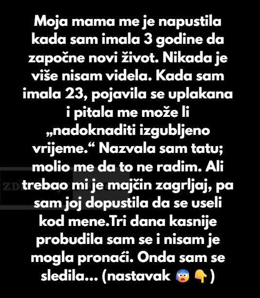 Kada sam imala samo tri godine majka me ostavlja i pocinje novi zivot a ja ostajem sama. Nikada je vise od tog trenutka nisam vidjela. Kada sam imala 23 godina desava se cudo, pojavila se uplakana i pitala me “da li moze sada da nadoknati se izgubljeno vrijeme” Nazvala sam tatu i molio me je da to ne radim, ali ja sam toliko losa bila, trebao mi je majcin zagrljaj pa sam joj dopustila da se useli kod mene. Tri dana poslije probudila sam se i nisam mogla da pronadjem. Onda sam se sledila kada sam vidjela..