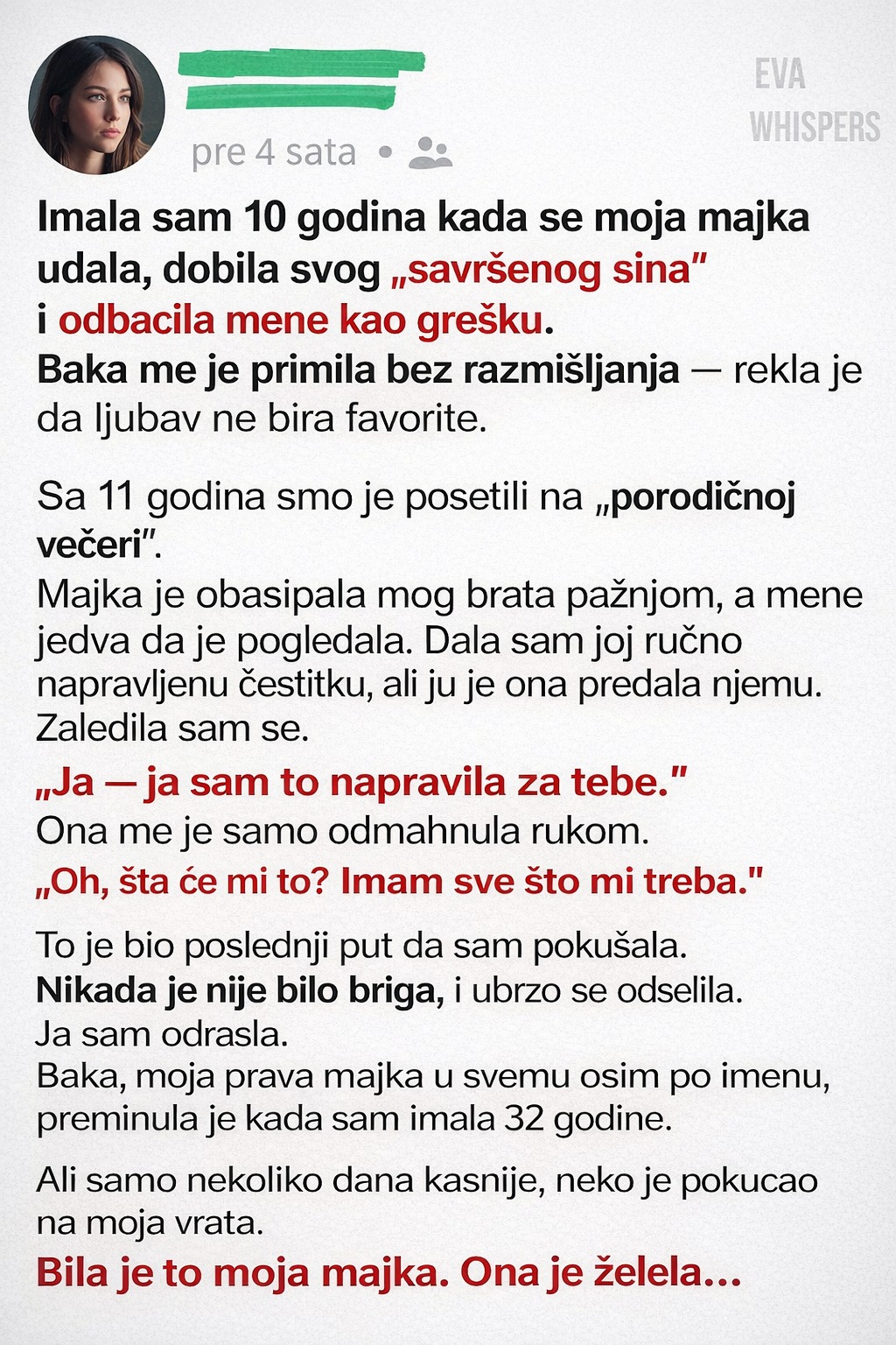 Odrastanje bez majke je iskustvo koje ostavlja dubok trag na svakome. Kada roditelj odluči otići i započeti novi život sa drugom porodicom, osjećaji koji ostaju iza toga mogu biti kompleksni — tuga, ljutnja, konfuzija, ali i nespokoj. Ova priča govori o ljudima koji su prošli kroz takvu situaciju, ali i o onome što se desilo godinama kasnije — u trenutku koji je promijenio pogled na prošlost.