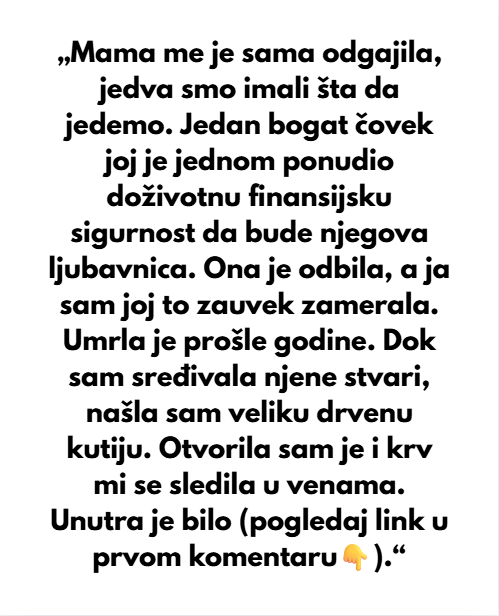 Moja majka me je sama odgajala a jedva smo imali sta da jedemo tada. Jedan bogati covjek nam je jednom ponudio dozivotnu sigurnsot da bi ja bila njegova ljubacnica. ona je odbila a ja sam joj zauvijek to sve zamjerila. Umrla je prosle godine a mi smo ljute bile jedna na drugu. Dok sam ja sredjivala njene stvari nasla sam tu jednu veliku drvenu kutiju. Otvorila sam i tada mi se krv sledila. Tu je bila moja malena slika iz djetinstva zalijepljena na jednu bijelu koverticu. Bankovna kartica sa PIN-om i tu je bilo njeno pismo.