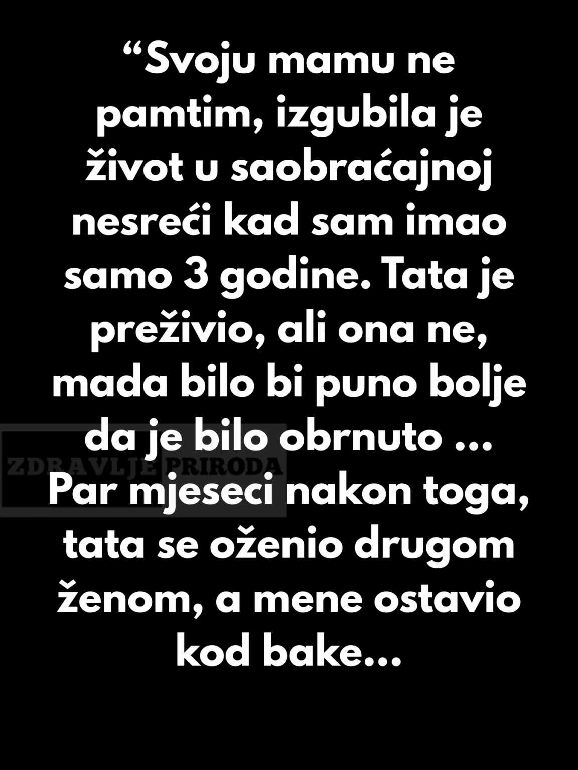 Dobio je i djecu sa tom drugom zenom i one su mu bile sve a ja za njega niko i nista. Prije nekoliko dana sam zavrsio fakultete zahvaljujuci baki koja je i zadnji dinar odvajala na mene i jucer me je necete vjerovati moj tata dodao na fb po prvi put. Malo mi je to cudno bilo da je to uradio bas kada sam diplomirao i da se sjetio i pozelio da me bas sada ima u prijateljima.
