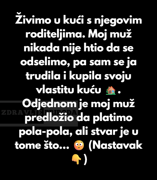 Mi smo u kuci njegovih roditelja. Moj suprug nikada nije htio da se mi odselimo ili da kuoimo sebi kucu poa sam se ja trudila da sve uspijem sama. Vremenom sam skupila oko 35 posto kapare za kucu. Zeljela sam da kupim svoju kucu na koju bi sama bila ponosna i na kraju necete moci da vjerujete da je to ona iz snova koju sam mastala.