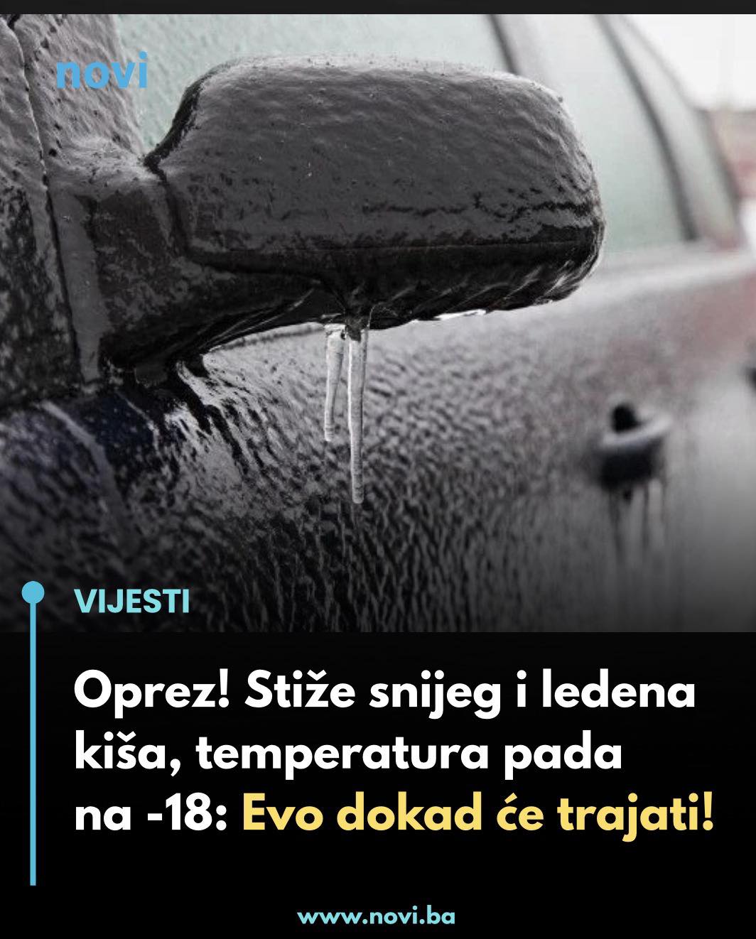 Pripremite se: pred nama je značajan ledeni val koji će donijeti snijeg, poledicu i oštre minuse, a meteorolozi najavljuju da će se ova hladna epizoda zadržati nekoliko dana. Ovo je važno za sve vozače, pješake i sve one koji se svakodnevno kreću na otvorenom jer ekstremni uvjeti mogu utjecati na saobraćaj, sigurnost i vaše planove.