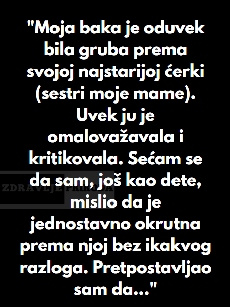Moja baka je oduvijek bila toliko gruba prema svojoj najstarijoj kcerki a to je sestra od moje majke. Uvijek je bila gruba, omalozavala je i na neki nacin kritikovala. Sjecam se da sam jos kao dijete mislila da je ona okrutna prema njoj bez ikakvog smisla i bez razloga. Mislio sam da ima svoje omiljene medju djecom i da je to bio ekstremni slucaj neki.