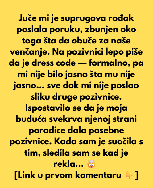 Onda sok ispostavilo se da je moja buduca svekrva na svojoj strani porodici poslala drugacije pozivnice. Kada sam se suocila sa tim ostlaa sam bez rijeci jer je rekal da bi se ona osjecala cudno jer je “nedovoljno svecano” ako pise tu formalno pa je zato ona to promijenila u novo da bi zastitila ufgled porodice. Nije mislila da ce to tako velika stvar da bude i da ce me to toliko povrijediti i dovesti do toliko problema.