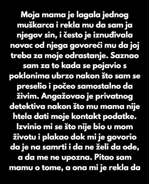 Odlucio sam tada da pitam majku o tome a ona mi je rekla da mu je to rekla da bi od njega dobijala novac jer joj je trebalo jer je ostavila mog oca i od njega nista nije mogla ni ti da dobije. DNk TEST JE POTVRDIO da on nije bio moj otac.