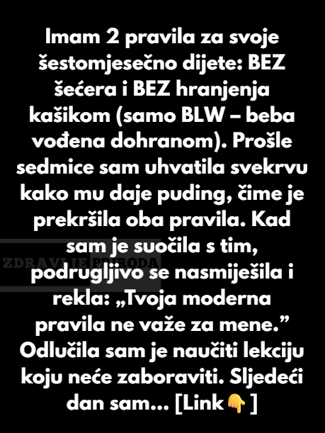 Ja sam imala dva pravila za svoje dijete od sest mjeseci a to je da ono je bez secera i bez hranjena kasikom- to jeste vodila sam se BLW metoda a to je dohrana vodjena od strane same bebe. Prosle sedmice sam uhvatila svekrvu kako ga hrani ni manje ni vise nego pudingom a to je prekrsila sva pravila. Kada sam je ja suocila sa svim tim ona je se samo meni podrugljivo nasmijala: “Tvoja moderna pravila roditeljska ne vaze za mene…” Odlucila sam da je sada naucim lekciju koju ona nikada nece zaboraviti.