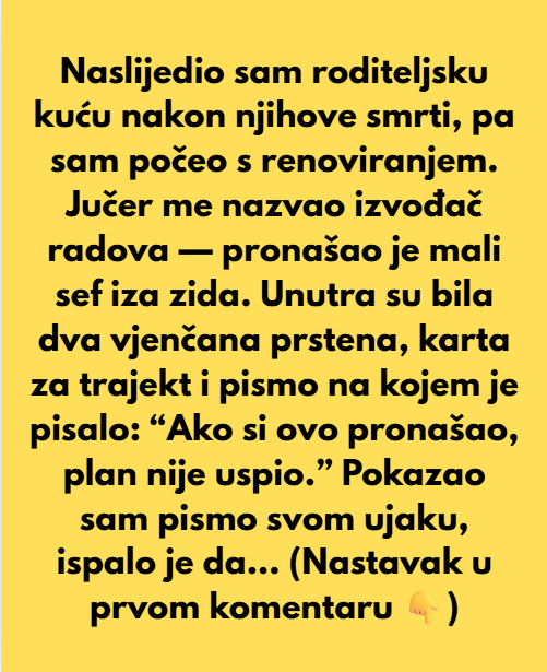 Naslijedio sam kucu od svojih roditelja nakon njihove smrti pa sam odlucio da bi trebao da pocnem da renoviram.Juce me zove izvodjac radova i rekao mi je da su pronasli maleni sef i to iza zida u kuhinji.