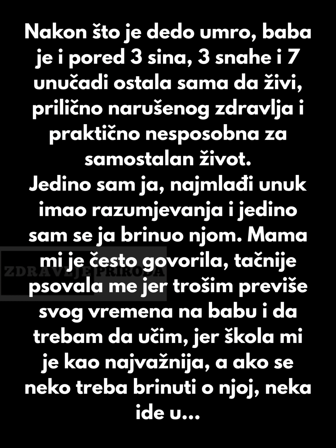 Jedino sam ja tada njen najmladji unuk imao razumjevanja i jedino sam ja brinuo o njoj. Mama mi je jako cesto govorila jer me je psovala da sam mnogo vremena trosim na babu i da joj trebam da ucim jer skola mi je bila najvaznija a ako se neko treba brinuti o njoj samo da ne bi isla u staracki dom. Majka mi je istina ali nisam previse paznje obracao na neke njene rijeci i trudio sam se maksimalno da budem uz babu koja nazalost nije ni dugo zivjela nakon dede samo godinu i tri mejseca. Tada sam vidio u kakvoj familiji ja zivim i odakle poticem i to je grozno.