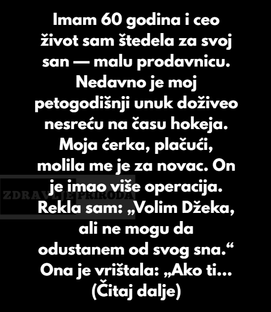 Ja sam rekla: “Volim Dzeka vise od svega ali svog sna se ne mogu odreci. Naci ce te vec vi nacin.” Ona je vristala i govorila: “Otvorit ces prodavnicu dok ti unuk lezi u bolnici i bori se da ponovo hoda. Kakva si ti baaba?”