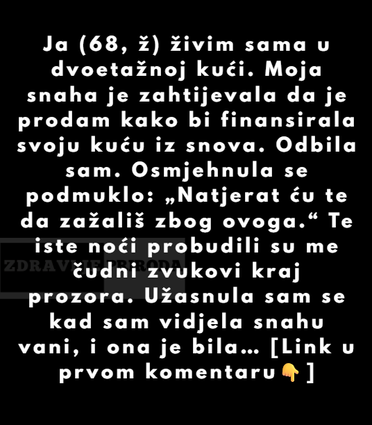 Te iste nocu u 2:30 ujutro su me probudili jako cudni zvukovi i to je bilo grebanje pored kraja prozora i to kod spavace sobe. Meni su se ruke tresle dok sam gledala vani. Vidjela sam tada svoju snahu u dvoristu i tu je koristial i ljestve i postavljala je tablu: -“Na prodaju…” Zaista je otisla do agenta za nekretnine i tu je napravila znak za prodaju i to sa mojom adresom. Nisam mogla da vjerujem na sta je bila spremna.