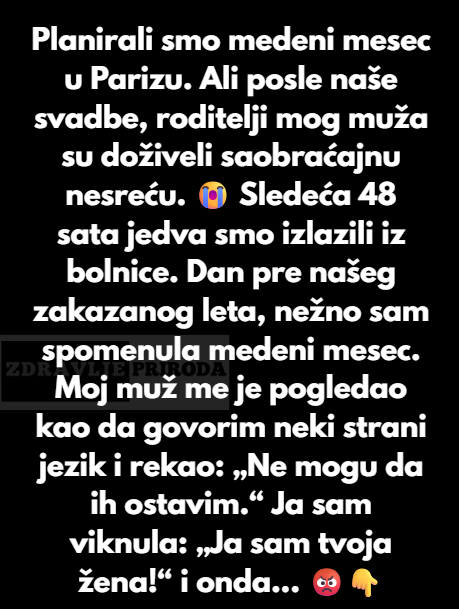 “VISE se oni ne bore za zivot, ljekari su rekli da su sada jako stabilni. Ovo je nas medeni mjesec,Dzek planirali smo ovo dugo!” Svadja je toliko eskalirala i rekla sam mu da idem bez njega jer smo za ovo dugo stedili i pripremali se i ne zelim da sve propadne. Sestra mi je rekla da sam bezosjecajna.