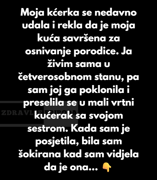Moja kci se nedavno udala te je rekal da je moj dom savrsen sto se tice osnivanja porodice. Ja od pocetka zivim sama u cetverosobnom stanu pa sam odlucila da joj to i poklonom i preselila sam se u maleni kucerak sa svojom sestrom. Ona je moje jedini dijete i koce ako necu ja da joj pomognem i ona mi je jedina porodica koju imam. Pokloniti joj kucu za koju je izrazila i zelju je bilo sasvim prirodno a ja sam i sama bila finansijska stabilna.