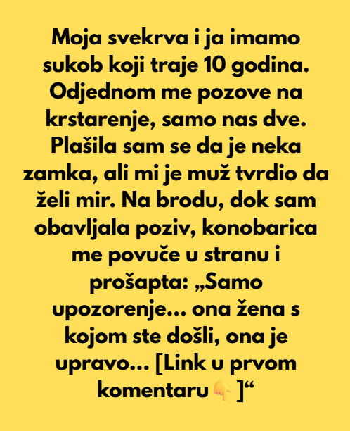 Ja nikada nisam imala dobar odnos sa svojom svekrvom. Cak i kada se rodio moj sin nas odnos je i dalje jako hladan bio i to punih 10 godina. Onda odjednom me je pozvala na krstarenje i to da idemo samo nas dvije. Mislila sam da se radi o nekoj zamki a moj suprug je insistirao na tome da idemo jer je zelio mir a i cinilo mu se da i ona zeli.