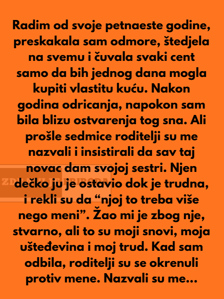 Nakon mnogo godina odricanja ja sam napokon bila korak na svom snu i ostvarenju svega. Ali prosle sedmice roditelji su me zvali i rekli da ja trebam sav taj novac da dam sestri. Njen decko ju je ostavio dok je bila trudna i rekli su mi ovako”njoj vise treba nego tebi”Meni je stvarno zao nje ali su ovo moji snovi moj tru i moja ustedjevina i ne zelim se odreci svega.