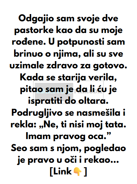 Ja sam Danijel imam 59 godina i nikada mi se vise nije svidjao izraz ocuh. Nisam se ozenio sa svojom zenom gledajuci ideju da budem polu roditelj njenim dvjema kcerkama. Od prvog dana sam i h toliko volio i tretirao kao da su moje. Sve sam im placao sve proteze za zube, fudbalske uniforme i sve ljetne kampove. Vozio sam ih u skolu na sve preglede kod ljekara i tu sam bio za kasne razgvore o momcima fakultetu i zivotu.
