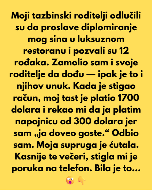 Roditelji od moje supruge su pozvali nas 12 rodjaka u jedan luksuzni restoran i to je bili povodom diplomiranja mog sina. Ja sam zamolio naravno tada i svoje roditelje da dodju jer smo slavili naravno njihovog unuka. Kada je stigao racun tada je moj tast platio 1700 dolara i zamolio me tada ja da budem taj koji ce da da napojnicu od 18 posto jer kako je rekao “ja sam doveo goste.” Naravno da sam odbio to i otisao a moja supruga je na sve to samo cutala.