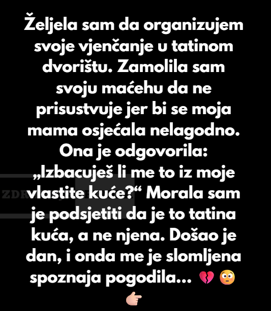 Moj san oduvijek je bio da drzim vjencanje u tatinom dvoristu. Te je za mene to trebao da bude lijep i jako divan i intiman dan ali sam onda i zamolila macehu da ne bude tu jer znam da bi se moja majka jako lose osjecala. Ali onda me je njen odgovor toliko sokirao i to je tako okrutno bilo.