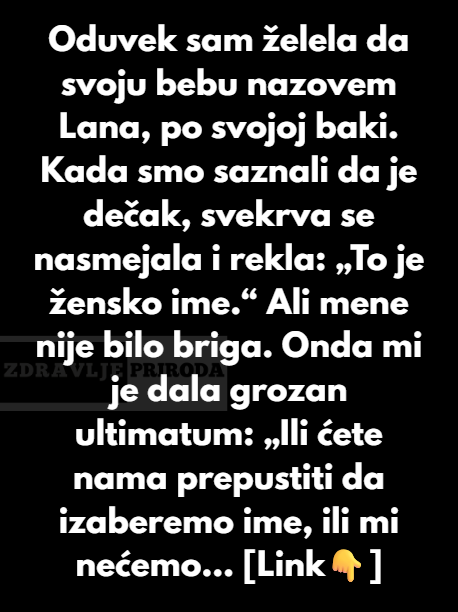 Ali tada kada sam mislila da ce da me razumije ona je samo odmahnula rukom i rekla je  “Ili ce te nama prepustiti izbor imena ili vam  necemo vise pomoci oko ucesca oko kuce.” Ja sam u tom trenutku ostala bez rijeci. Moj supurg je toliko se sokirao i djelovao mi rastrzano.