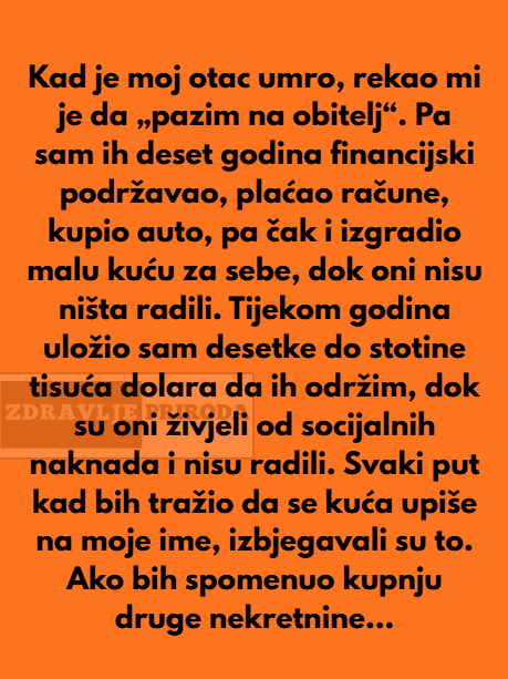 Svaki put kada bi trazio da se kuca upise na moje ime oni bi sve to izbjegli. Ako bi ko spomenu kupnju neke druge nekretnine manupilirali bi da ja treba da odustanem. Imali su naviku da posude moj alat kada nisam bio kod kuce ili su skidali dijelove sa mog auta da bi popravili svoje olupine a da nikada nisu pitali nista.