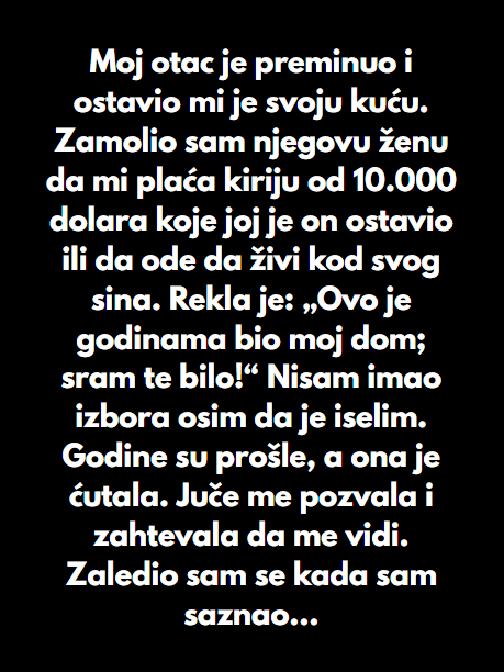 Godine su prolazile od toga a ona je cutala svo vrijeme. Pozvala me je jucer i trazila je i zahtjevala da se vidimo ponovo. Zaledila sam se kada sam saznala da je novi, maleni stan u kojem ona sada zivi ustvari kupio moj otac.