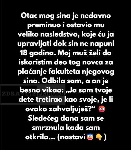 Tada sam toliko bijesnila i odbila a on mi je rekao: “Kako mozes da budes takva ja sam tvoje dijete tretirao kao da je moje i ti mi tako na taj nacin zahvaljujes.” Rekla sam mu onda: “ZAO MI JE ali to sto si odgajao mog sina ne daje ti pravo da mozes da koristist njegov novac.”