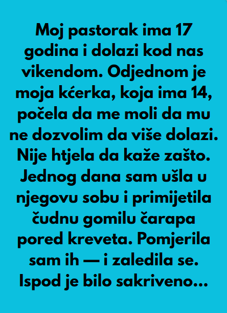 Pastorak ima 17 godina i jako cesto nas posjecuje vikendom. Odjednom kcerka od 14 godina pocela da moli da mu ne dozvolim da vise dolazi. Nije htjela da mi nikako objasni zasto i govorila da zeli zadrzati za sebe.
